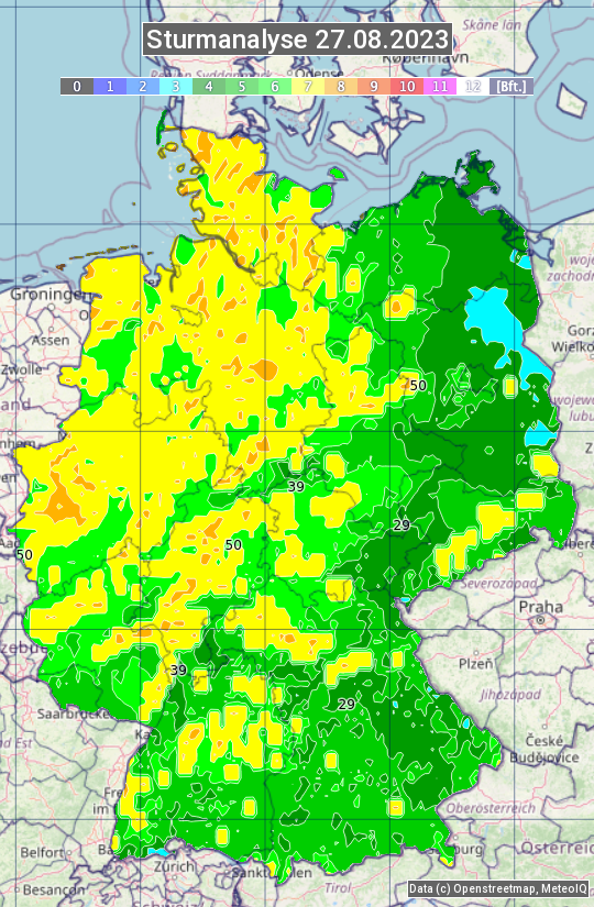 Die Sturmanalyse vom 27.08.2023 zeigt die maximalen Windböen des Tages. Die Angabe erfolgt als Windstärke in Beaufort.