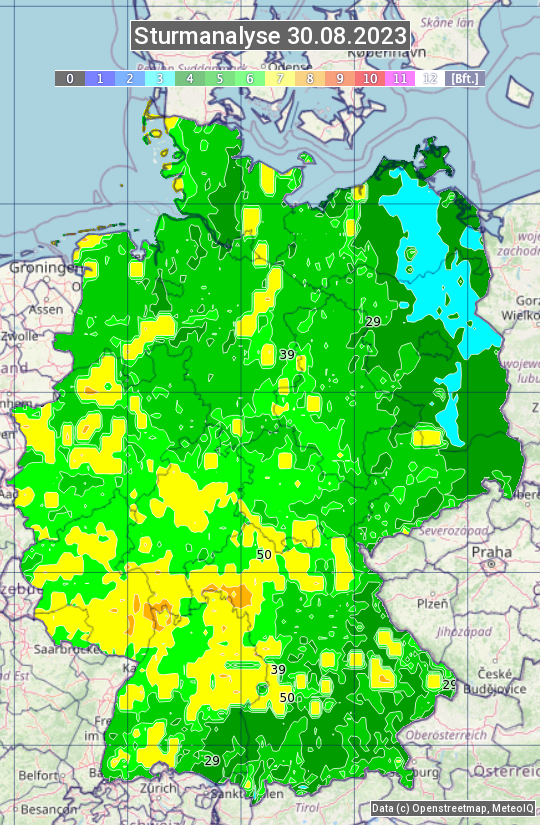 Die Sturmanalyse vom 30.08.2023 zeigt die maximalen Windböen des Tages. Die Angabe erfolgt als Windstärke in Beaufort.