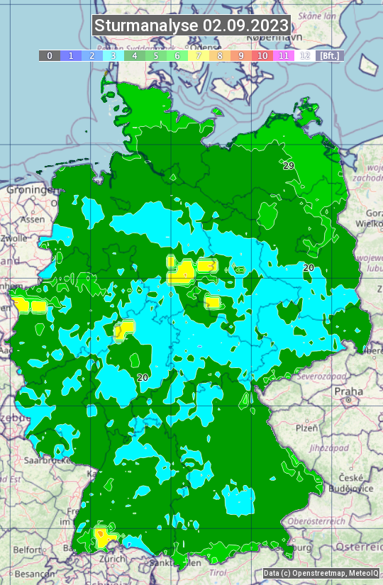 Die Sturmanalyse vom 02.09.2023 zeigt die maximalen Windböen des Tages. Die Angabe erfolgt als Windstärke in Beaufort.