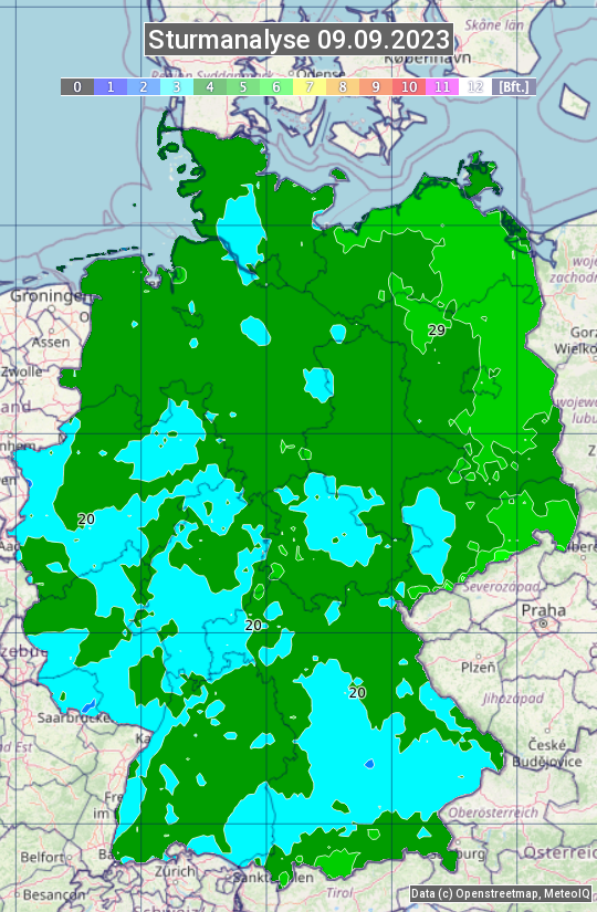 Die Sturmanalyse vom 09.09.2023 zeigt die maximalen Windböen des Tages. Die Angabe erfolgt als Windstärke in Beaufort.