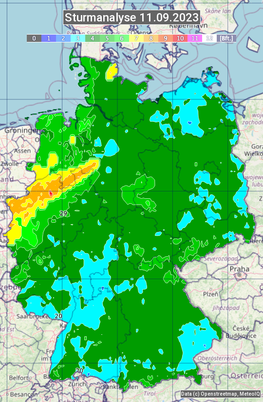 Die Sturmanalyse vom 11.09.2023 zeigt die maximalen Windböen des Tages. Die Angabe erfolgt als Windstärke in Beaufort.