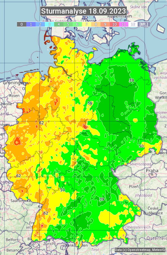 Die Sturmanalyse vom 18.09.2023 zeigt die maximalen Windböen des Tages. Die Angabe erfolgt als Windstärke in Beaufort.
