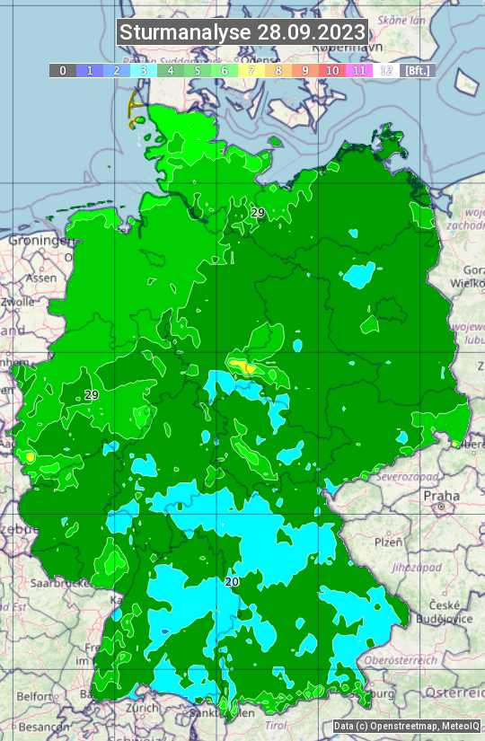 Die Sturmanalyse vom 28.09.2023 zeigt die maximalen Windböen des Tages. Die Angabe erfolgt als Windstärke in Beaufort.