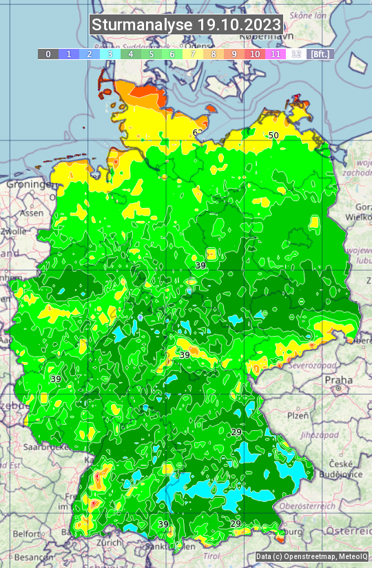Die Sturmanalyse vom 19.10.2023 zeigt die maximalen Windböen des Tages. Die Angabe erfolgt als Windstärke in Beaufort.