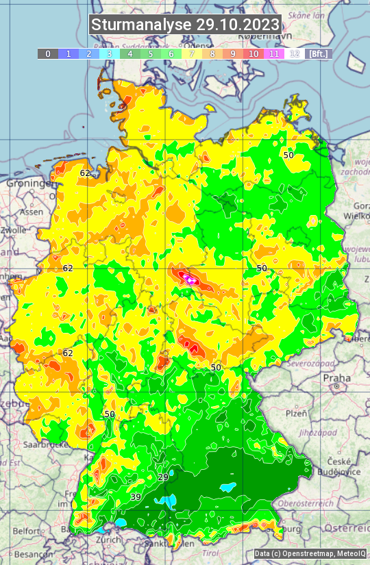 Die Sturmanalyse vom 29.10.2023 zeigt die maximalen Windböen des Tages. Die Angabe erfolgt als Windstärke in Beaufort.