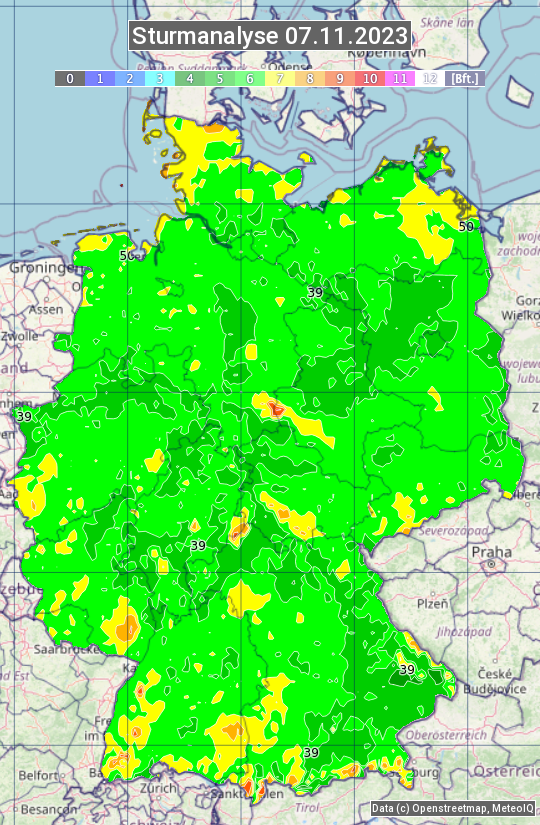 Die Sturmanalyse vom 07.11.2023 zeigt die maximalen Windböen des Tages. Die Angabe erfolgt als Windstärke in Beaufort.