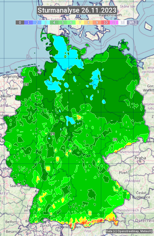 Die Sturmanalyse vom 26.11.2023 zeigt die maximalen Windböen des Tages. Die Angabe erfolgt als Windstärke in Beaufort.