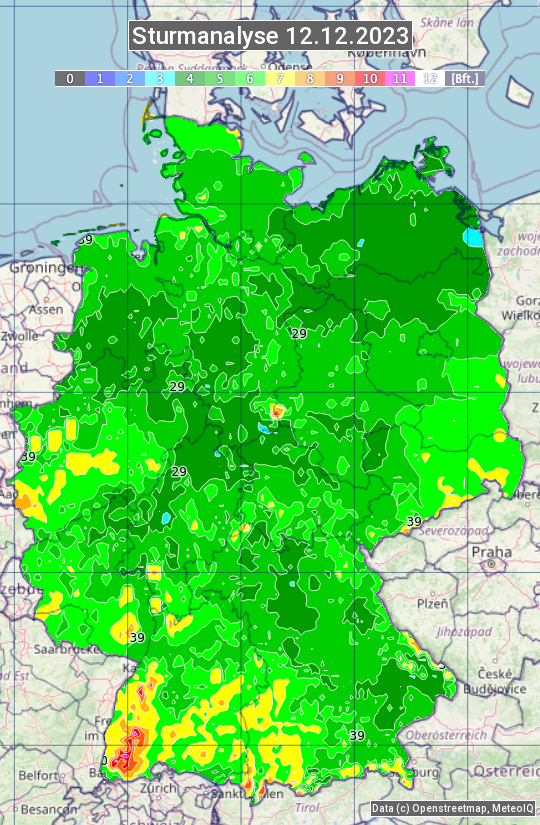 Die Sturmanalyse vom 12.12.2023 zeigt die maximalen Windböen des Tages. Die Angabe erfolgt als Windstärke in Beaufort.