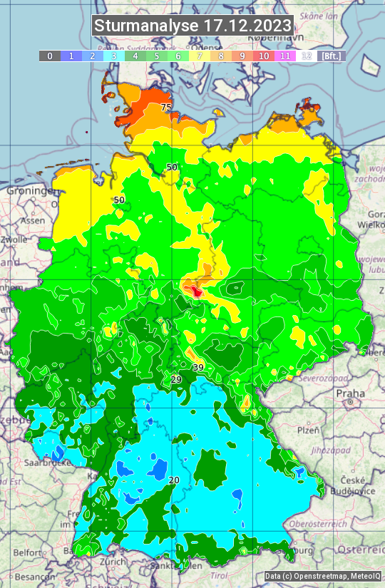 Die Sturmanalyse vom 17.12.2023 zeigt die maximalen Windböen des Tages. Die Angabe erfolgt als Windstärke in Beaufort.