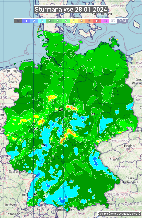 Die Sturmanalyse vom 28.01.2024 zeigt die maximalen Windböen des Tages. Die Angabe erfolgt als Windstärke in Beaufort.
