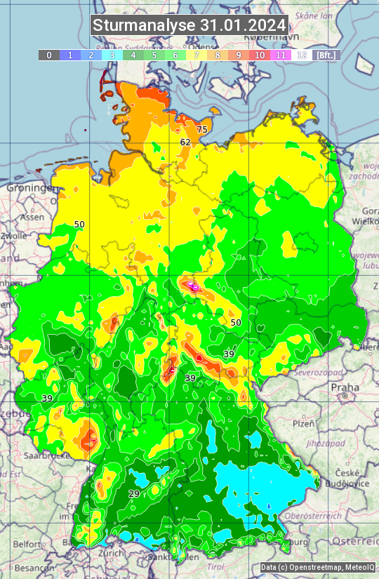 Die Sturmanalyse vom 31.01.2024 zeigt die maximalen Windböen des Tages. Die Angabe erfolgt als Windstärke in Beaufort.