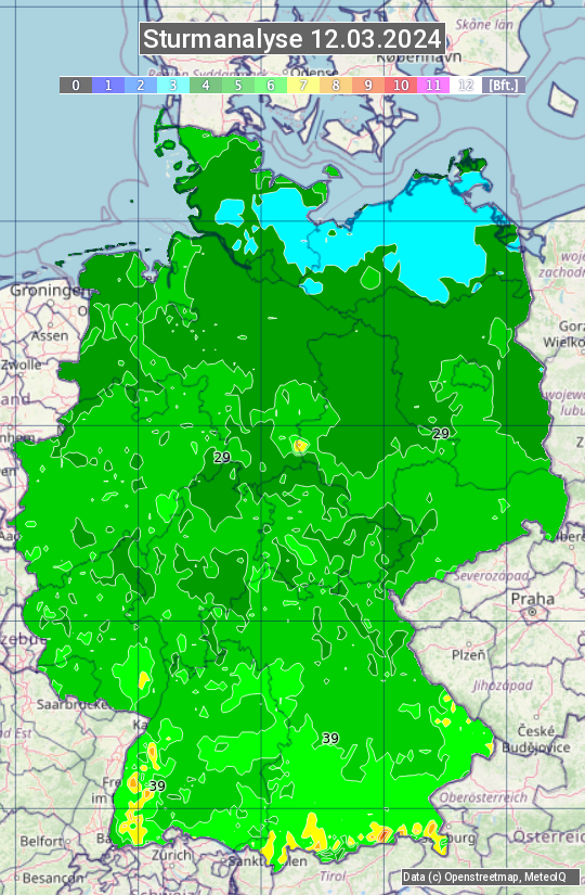 Die Sturmanalyse vom 12.03.2024 zeigt die maximalen Windböen des Tages. Die Angabe erfolgt als Windstärke in Beaufort.