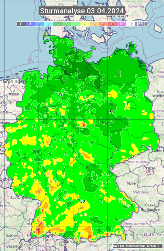 Die Sturmanalyse vom 03.04.2024 zeigt die maximalen Windböen des Tages. Die Angabe erfolgt als Windstärke in Beaufort.