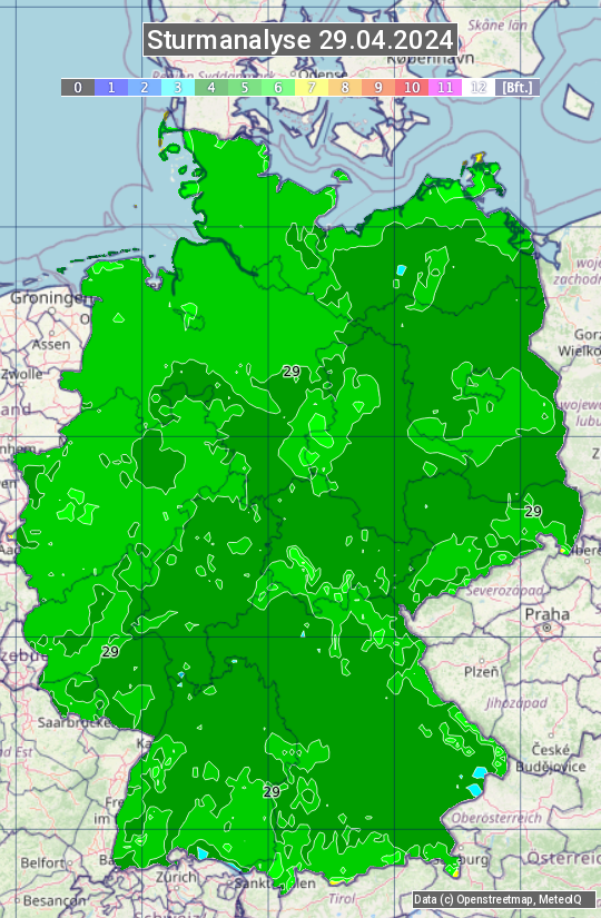 Die Sturmanalyse vom 29.04.2024 zeigt die maximalen Windböen des Tages. Die Angabe erfolgt als Windstärke in Beaufort.