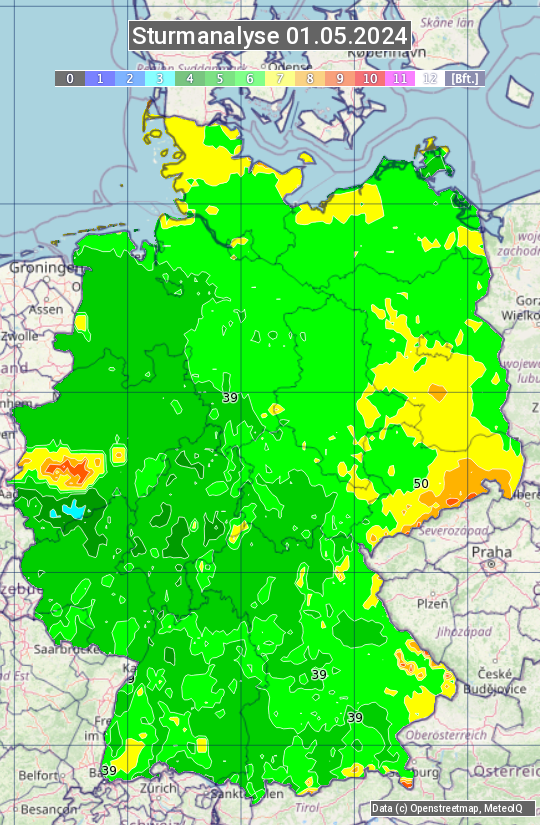 Die Sturmanalyse vom 01.05.2024 zeigt die maximalen Windböen des Tages. Die Angabe erfolgt als Windstärke in Beaufort.