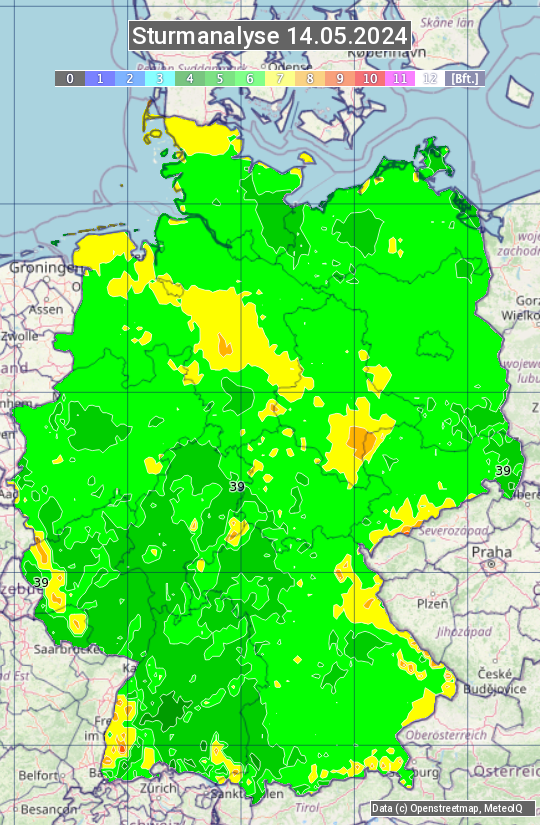 Die Sturmanalyse vom 14.05.2024 zeigt die maximalen Windböen des Tages. Die Angabe erfolgt als Windstärke in Beaufort.