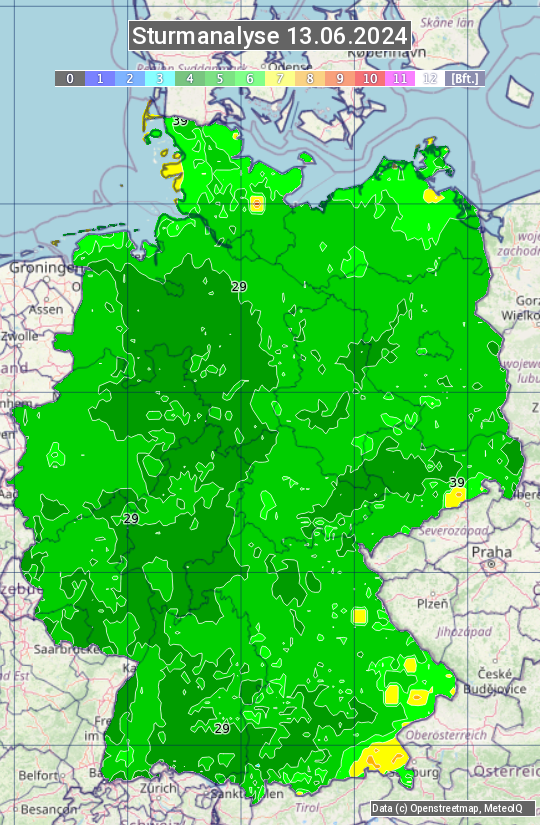 Die Sturmanalyse vom 13.06.2024 zeigt die maximalen Windböen des Tages. Die Angabe erfolgt als Windstärke in Beaufort.