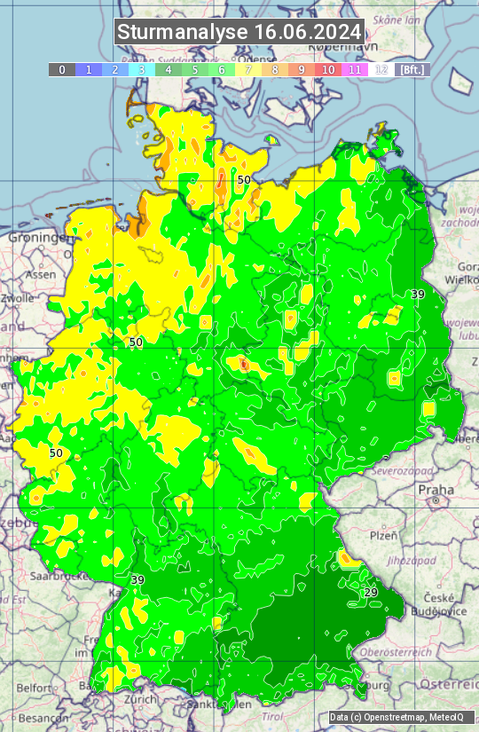 Die Sturmanalyse vom 16.06.2024 zeigt die maximalen Windböen des Tages. Die Angabe erfolgt als Windstärke in Beaufort.