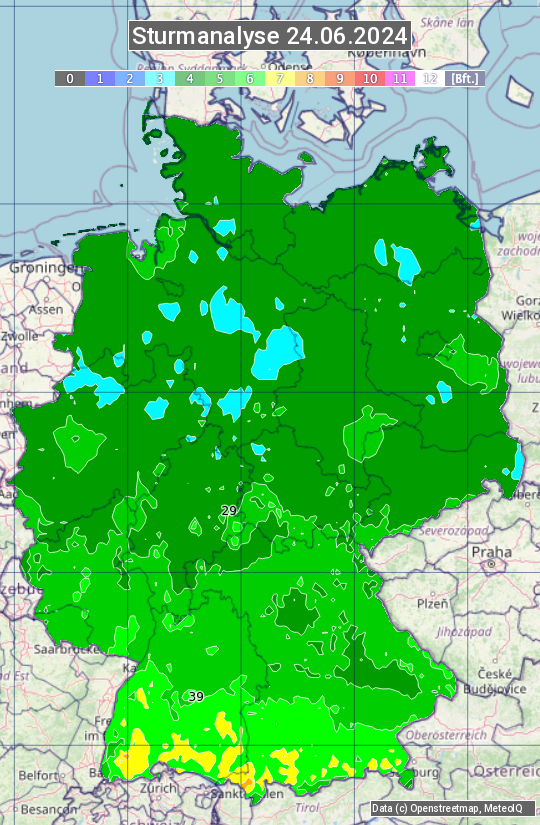 Die Sturmanalyse vom 24.06.2024 zeigt die maximalen Windböen des Tages. Die Angabe erfolgt als Windstärke in Beaufort.