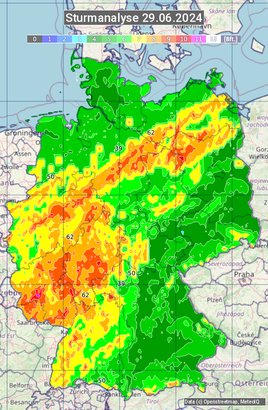 Die Sturmanalyse vom 29.06.2024 zeigt die maximalen Windböen des Tages. Die Angabe erfolgt als Windstärke in Beaufort.