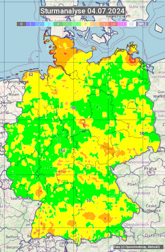 Die Sturmanalyse vom 04.07.2024 zeigt die maximalen Windböen des Tages. Die Angabe erfolgt als Windstärke in Beaufort.