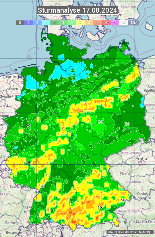 Die Sturmanalyse vom 17.08.2024 zeigt die maximalen Windböen des Tages. Die Angabe erfolgt als Windstärke in Beaufort.