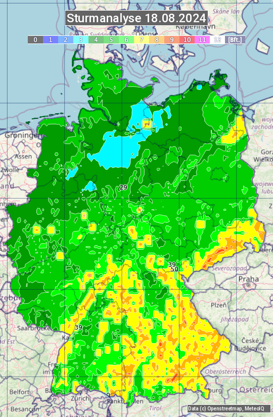 Die Sturmanalyse vom 18.08.2024 zeigt die maximalen Windböen des Tages. Die Angabe erfolgt als Windstärke in Beaufort.