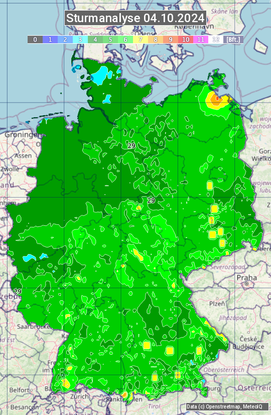 Die Sturmanalyse vom 04.10.2024 zeigt die maximalen Windböen des Tages. Die Angabe erfolgt als Windstärke in Beaufort.
