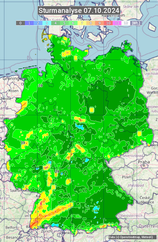 Die Sturmanalyse vom 07.10.2024 zeigt die maximalen Windböen des Tages. Die Angabe erfolgt als Windstärke in Beaufort.