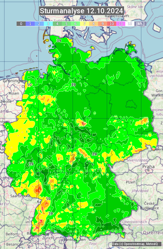 Die Sturmanalyse vom 12.10.2024 zeigt die maximalen Windböen des Tages. Die Angabe erfolgt als Windstärke in Beaufort.