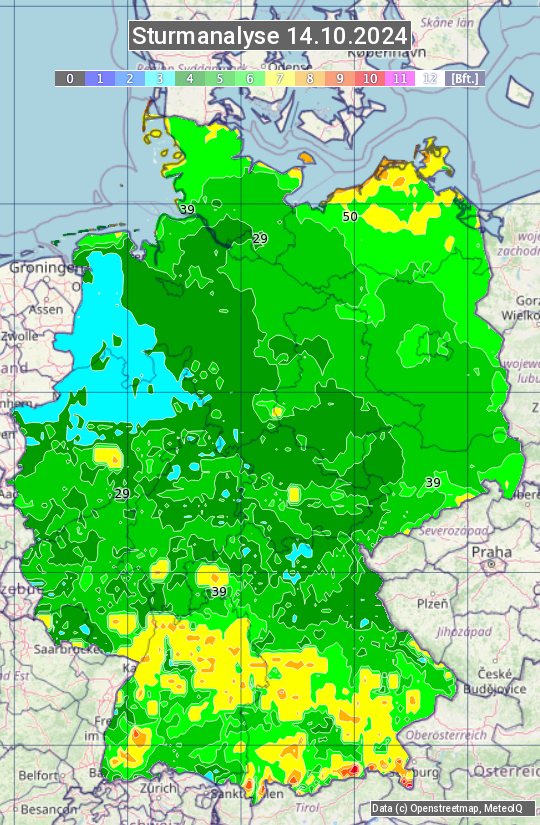 Die Sturmanalyse vom 14.10.2024 zeigt die maximalen Windböen des Tages. Die Angabe erfolgt als Windstärke in Beaufort.