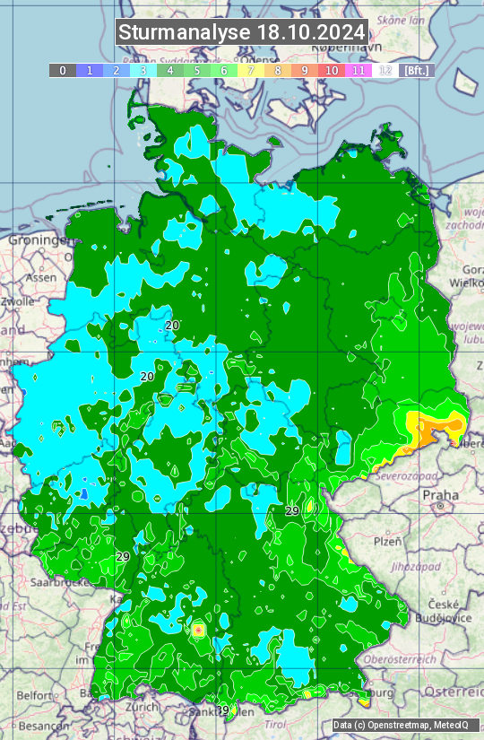 Die Sturmanalyse vom 18.10.2024 zeigt die maximalen Windböen des Tages. Die Angabe erfolgt als Windstärke in Beaufort.