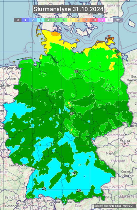 Die Sturmanalyse vom 31.10.2024 zeigt die maximalen Windböen des Tages. Die Angabe erfolgt als Windstärke in Beaufort.