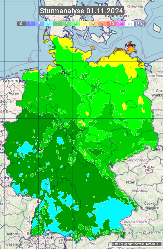 Die Sturmanalyse vom 01.11.2024 zeigt die maximalen Windböen des Tages. Die Angabe erfolgt als Windstärke in Beaufort.
