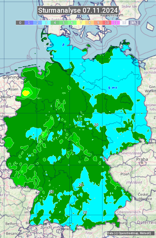 Die Sturmanalyse vom 07.11.2024 zeigt die maximalen Windböen des Tages. Die Angabe erfolgt als Windstärke in Beaufort.