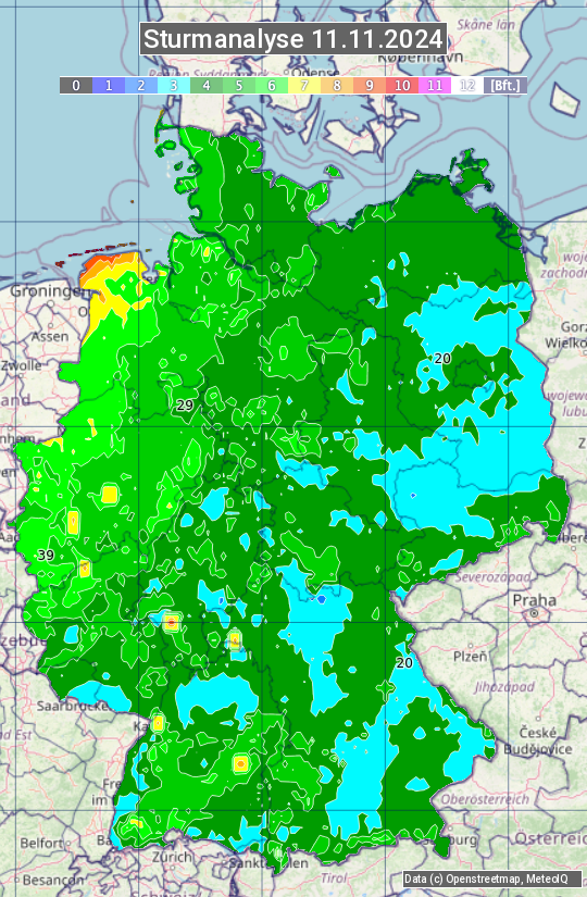 Die Sturmanalyse vom 11.11.2024 zeigt die maximalen Windböen des Tages. Die Angabe erfolgt als Windstärke in Beaufort.