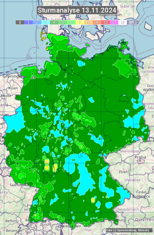 Die Sturmanalyse vom 13.11.2024 zeigt die maximalen Windböen des Tages. Die Angabe erfolgt als Windstärke in Beaufort.