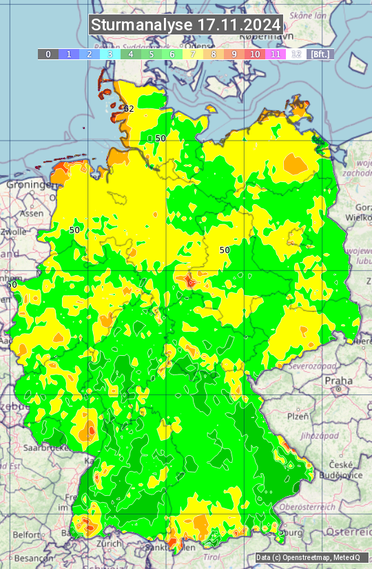 Die Sturmanalyse vom 17.11.2024 zeigt die maximalen Windböen des Tages. Die Angabe erfolgt als Windstärke in Beaufort.