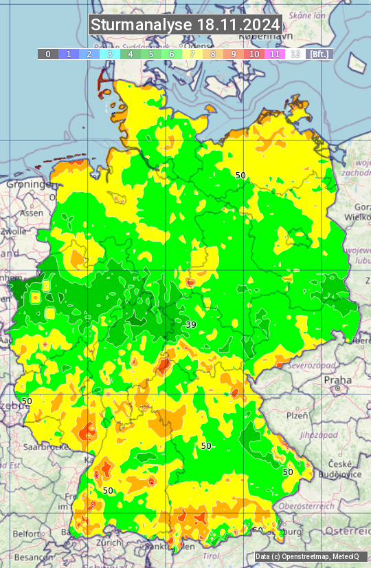 Die Sturmanalyse vom 18.11.2024 zeigt die maximalen Windböen des Tages. Die Angabe erfolgt als Windstärke in Beaufort.