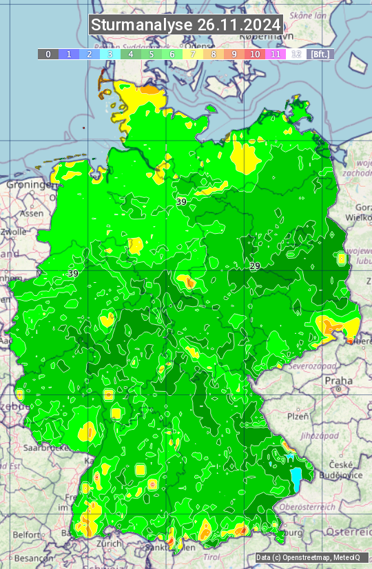 Die Sturmanalyse vom 26.11.2024 zeigt die maximalen Windböen des Tages. Die Angabe erfolgt als Windstärke in Beaufort.