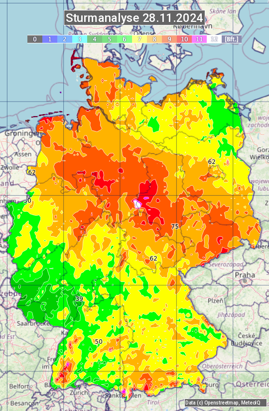 Die Sturmanalyse vom 28.11.2024 zeigt die maximalen Windböen des Tages. Die Angabe erfolgt als Windstärke in Beaufort.