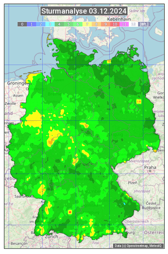 Die Sturmanalyse vom 03.12.2024 zeigt die maximalen Windböen des Tages. Die Angabe erfolgt als Windstärke in Beaufort.