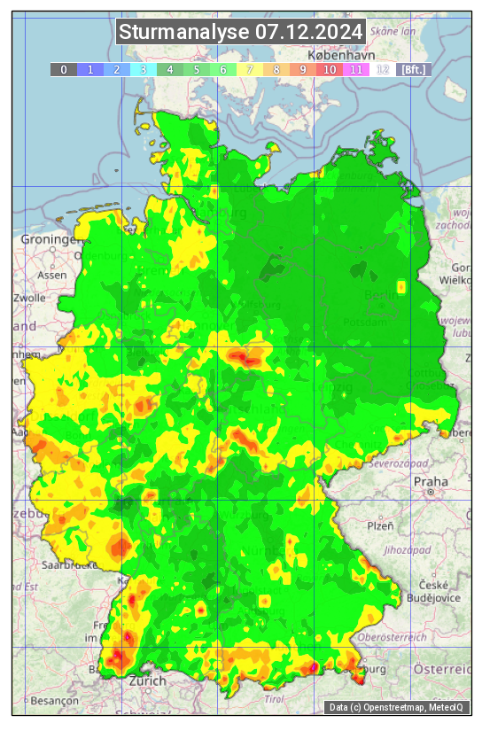 Die Sturmanalyse vom 07.12.2024 zeigt die maximalen Windböen des Tages. Die Angabe erfolgt als Windstärke in Beaufort.