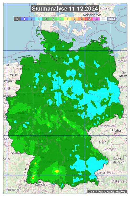 Die Sturmanalyse vom 11.12.2024 zeigt die maximalen Windböen des Tages. Die Angabe erfolgt als Windstärke in Beaufort.
