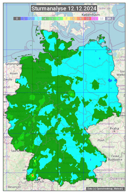 Die Sturmanalyse vom 12.12.2024 zeigt die maximalen Windböen des Tages. Die Angabe erfolgt als Windstärke in Beaufort.