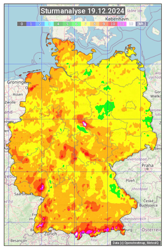 Die Sturmanalyse vom 19.12.2024 zeigt die maximalen Windböen des Tages. Die Angabe erfolgt als Windstärke in Beaufort.