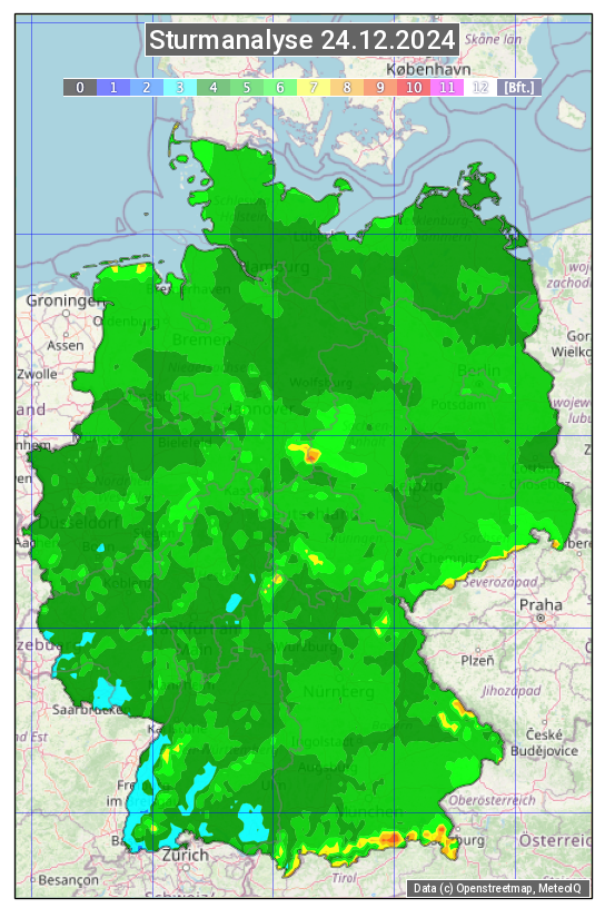 Die Sturmanalyse vom 24.12.2024 zeigt die maximalen Windböen des Tages. Die Angabe erfolgt als Windstärke in Beaufort.