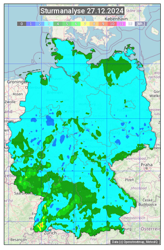 Die Sturmanalyse vom 27.12.2024 zeigt die maximalen Windböen des Tages. Die Angabe erfolgt als Windstärke in Beaufort.