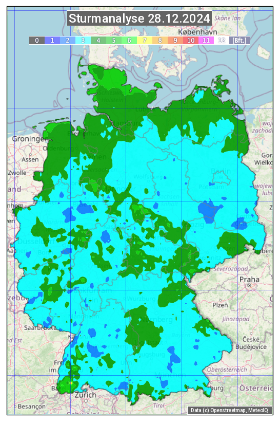 Die Sturmanalyse vom 28.12.2024 zeigt die maximalen Windböen des Tages. Die Angabe erfolgt als Windstärke in Beaufort.