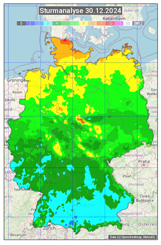 Die Sturmanalyse vom 30.12.2024 zeigt die maximalen Windböen des Tages. Die Angabe erfolgt als Windstärke in Beaufort.